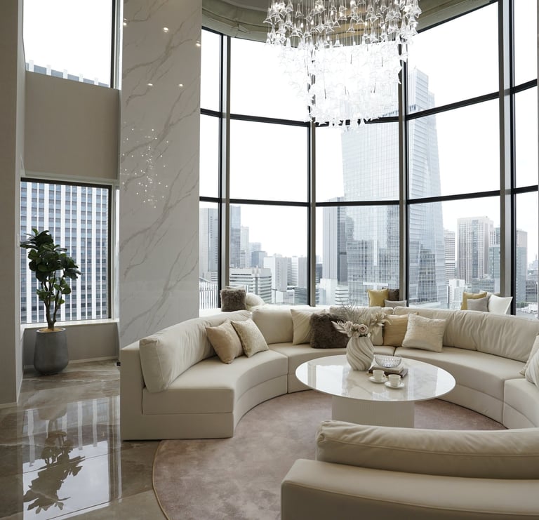 Modern luxury with panoramic views, custom interiors, and extensive shared facilities.