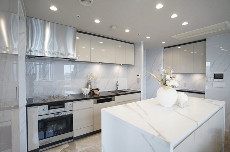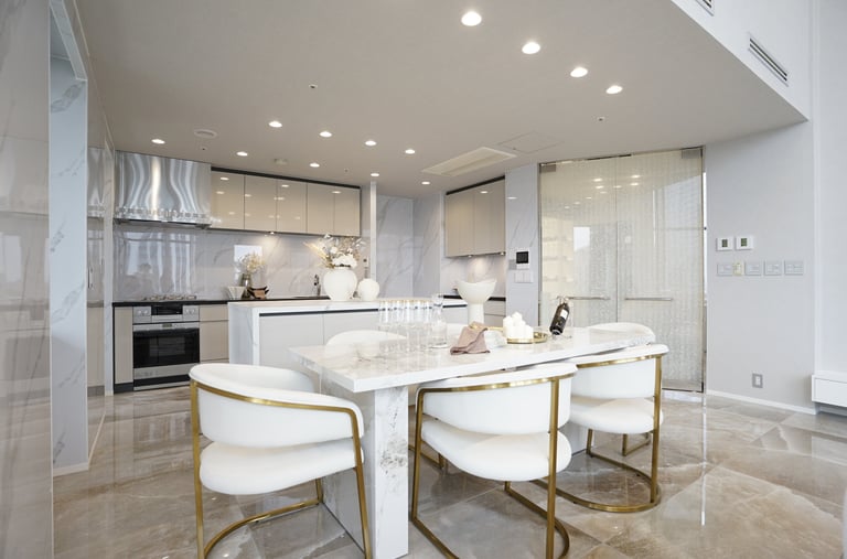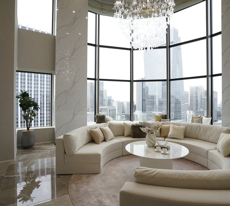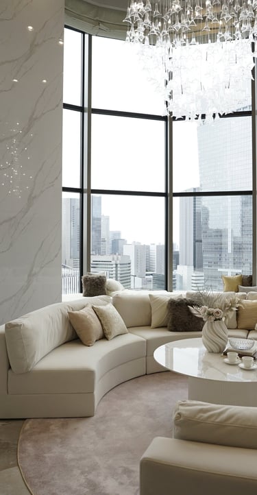 Modern luxury with panoramic views, custom interiors, and extensive shared facilities.